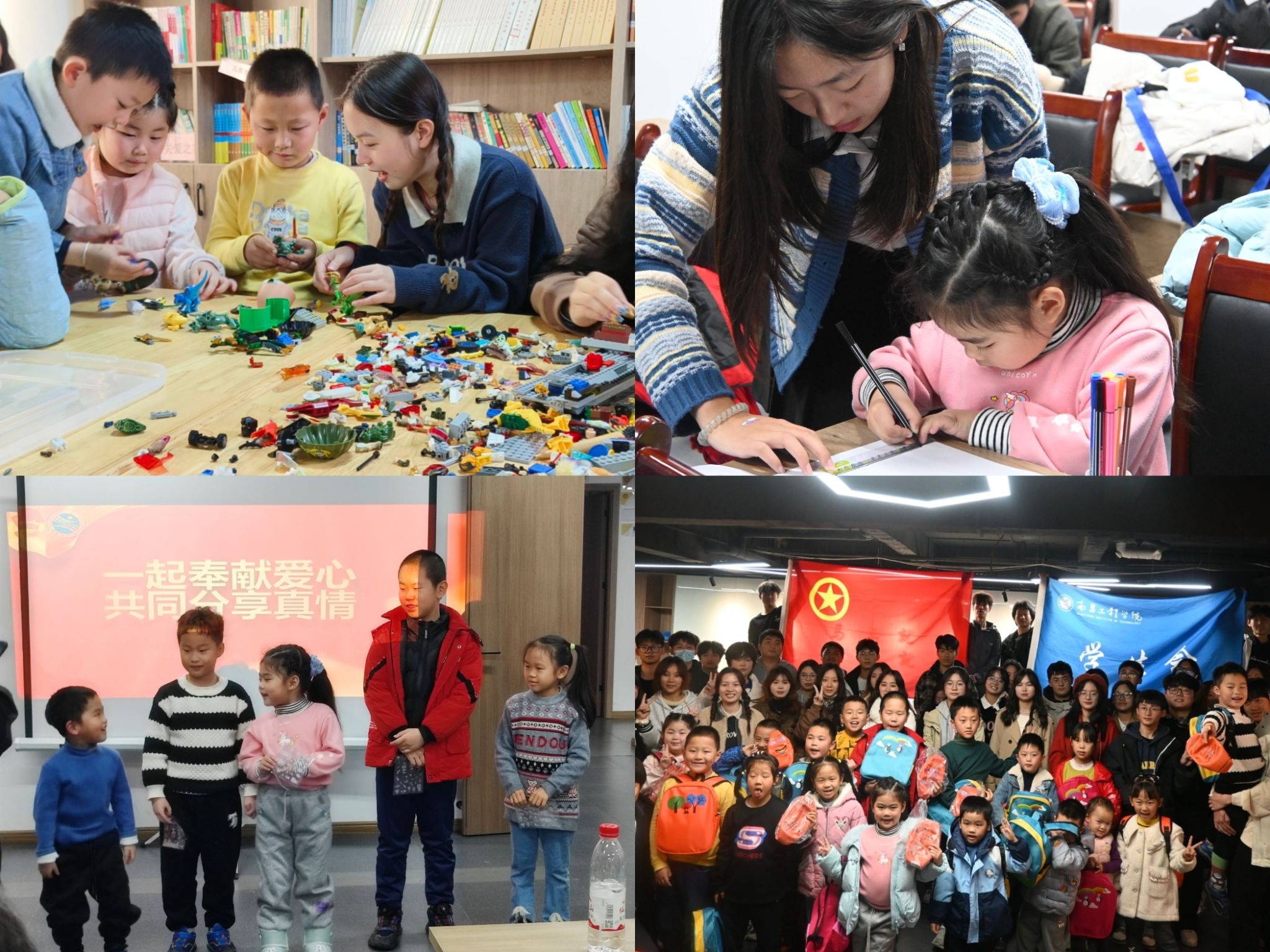 学生会成员通过开展数字抱抱、萝卜蹲、抢椅子、击鼓传花等游戏,让小朋友们在游戏的互动中感受到团队合作与童真乐趣,并指导小朋友们根据自己的兴趣分别用画笔和积木描绘和搭建自己的梦想,在绘画和搭积木中感受和展现自我。最后,学生会全体成员为小朋友们发放文具、玩具等礼品,并邀请家长和小朋友们一起合影留念。