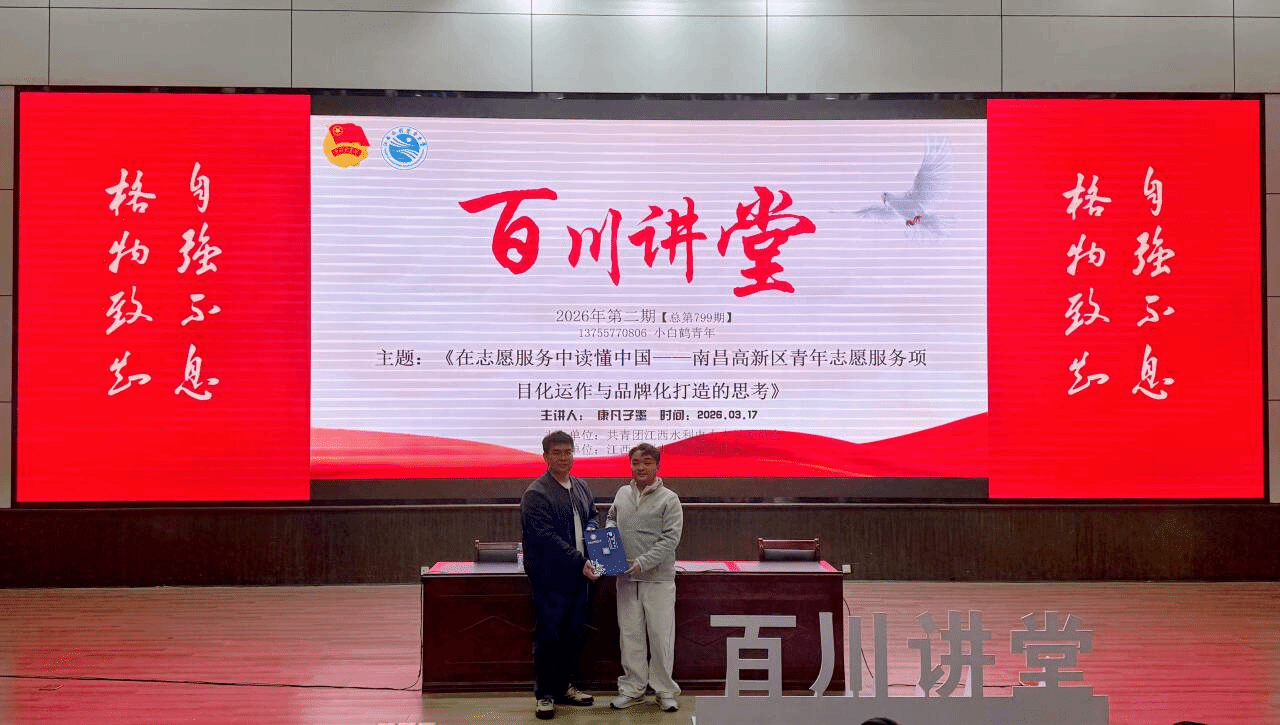 3月17日19时,由校团委主办、校学生会承办的第799期百川讲堂于大禹学术报告厅如期开讲。本期活动特别邀请共青团南昌高新区工委副书记、南昌互联网创业协会副秘书长康凡子墨老师担任主讲。康老师围绕《在志愿服务中读懂中国——南昌高新区青年志愿服务项目化运作与品牌化打造的思考》这一主题,为学校青年学子带来了一场兼具理论深度与实践温度的分享。